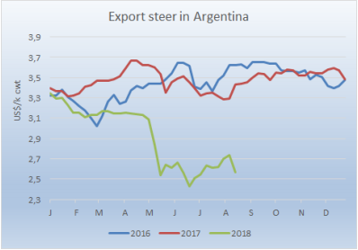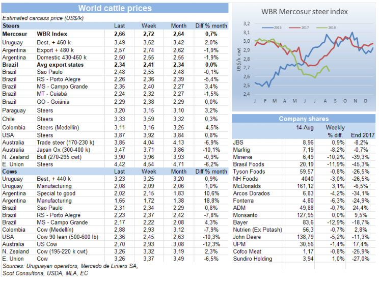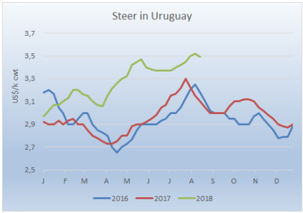 美國和土耳其的政治危機(jī)嚴(yán)重影響到了新興國家的貨幣,南方共同市場各國也受到了影響,本地閹牛均價被拉低。本周南方共同市場閹牛指數(shù)降低了6美分到2.66美金/公斤,近四周最低。前期由于本地牛價上漲以及貨幣貶值趨緩,美金牛價逐漸恢復(fù),此趨勢被打破,阿根廷比索對美元貶值8.2%,巴西雷亞爾貶值3.6%。巴西本地育肥牛價漲到137.1雷亞爾,漲幅0.8雷亞爾,但換算成美元降低了7美分到2.34美金,阿根廷情況也一樣,出口閹牛價格漲了1比索,但由于貨幣貶值,美金價減少了17美分至2.57美金。烏拉圭牛價也顯示出降低趨勢,因?yàn)楠q太團(tuán)隊(duì)即將撤離,開始為481配額準(zhǔn)備牛肉生產(chǎn)。本地區(qū)只有巴拉圭一個國家牛價上漲,漲了5美分。