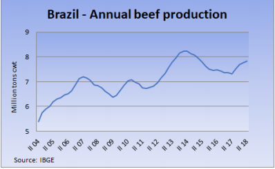 2018年至今,巴西增加了冷鮮牛肉對南美地區(qū)的出口量,從去年前7個月的2.6萬噸增加到6.1萬噸,增加了138%,巴拉圭不能出口智利增加了該市場對巴西產(chǎn)品的需求,而且巴西相對于其他國家牛肉價格較低,也提高了產(chǎn)品競爭力。