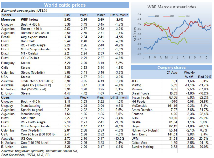 當(dāng)?shù)刎泿抛呷醭掷m(xù)影響活牛價格,以本地貨幣成交活牛的國家競爭力增強(qiáng),南美共同市場閹牛指數(shù)本周又下跌了4美分到2.62美金/公斤,7月初以來最低。巴西雷亞爾對美金貶值了2.4%,阿根廷比索對美金貶值了1.2%,所以兩國美金牛價都下跌了4美分,巴西2.3美金/公斤,阿根廷2.53美金/公斤,烏拉圭市場形勢有所改變,猶太市場暫停,專注于481配額的谷飼牛肉生產(chǎn),巴拉圭牛價和上周一樣沒有變化。
