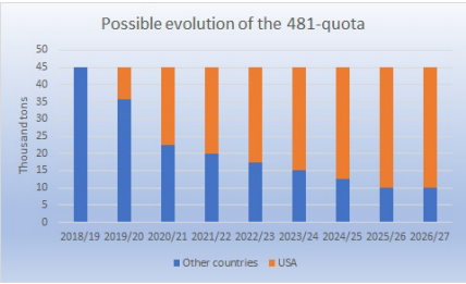 美國與歐盟已經(jīng)就481配額達成協(xié)議,歐盟初步給美國1.85萬噸的獨家配額,六年半之后逐步增加到3.5萬噸。481配額總共4.5萬噸,分四個季度,每季度1.125萬噸,由美國、烏拉圭、阿根廷、澳洲、新西蘭和加拿大分配。協(xié)議生效后,原有國家配額將在2020年上半年先減少9250噸,然后每年減少2500噸,直至2025/26年減少到只剩1萬噸。近幾年烏拉圭和澳洲每年各用掉1.6萬噸481配額,他們的配額將會大幅減少,阿根廷481配額增長也很迅速,去年達到6800噸,也會受到配額減少的影響。
