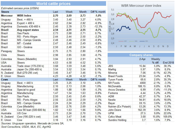 第一季度烏拉圭對歐盟出口了9535噸冷鮮牛肉,同比增長1%,因?yàn)橄栴D配額價格下跌,平均離岸價跌了4%到9367美金,而冷凍牛肉市場反應(yīng)冷淡,三月出口817噸,第一季度2877噸,同比減少42%,離岸均價6532美金,同比下跌11%。烏拉圭18/19農(nóng)業(yè)年希爾頓和481配額出口量都有所下降,截止到3月22日,希爾頓配額出口量4905噸,同比減少5.5%,481配額出口9961噸,同比減少13.5%,希爾頓配額離岸均價跌了9.8%到10628美元,而481配額均價跌了2.9%到9417美元。