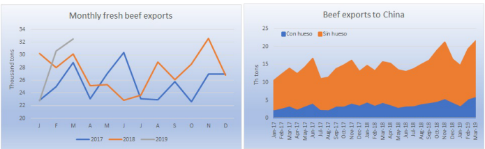中國市場作為烏拉圭牛肉最主要的買家份額還在增長,三月份共進(jìn)口21511噸牛肉,占烏拉圭總出口量32458噸的66%,創(chuàng)下新的月度紀(jì)錄,中國采購了6071噸帶骨和15440噸去骨牛肉。第一季度帶骨牛肉銷售量漲了18%,而去骨牛肉漲了31%,均價也有增加,帶骨均價3246美金離岸價,上漲9%,去骨牛肉4512美金離岸價,上漲4%。北美市場,主要是美國市場排名第二,第一季度共進(jìn)口12880噸牛肉,同比增長12%。三月份以色列市場排第三,進(jìn)口1071噸,但進(jìn)口量同比跌了68%。