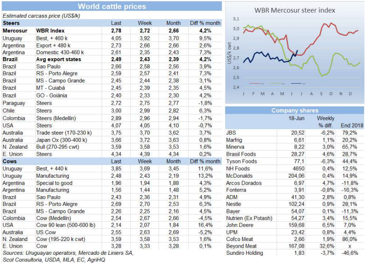 活牛價(jià)格堅(jiān)挺、貨幣穩(wěn)定推高了南方共同市場(chǎng)閹牛價(jià)格,本周增長(zhǎng)了6美分到2.78美金/公斤,達(dá)到2018年五月以來(lái)最高值。巴西重新可以出口中國(guó)之后,活牛價(jià)格上漲,把之前的跌幅全部漲回來(lái)了,主要出口州育肥閹牛價(jià)格漲了3雷亞爾/15公斤,達(dá)到140.5雷亞爾,換算成美金漲了6美分到2.49美金。烏拉圭牛價(jià)漲到4美金以上,自2011年以來(lái)第一次,阿根廷閹牛價(jià)格和上周一樣,但比索增值2.6%,美金牛價(jià)漲了7美分到2.73美金,只有巴拉圭牛價(jià)小幅下跌3美分到2.72美金。
