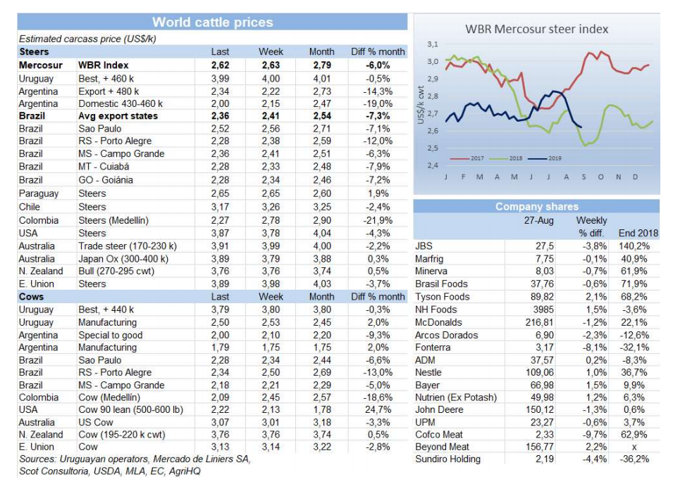 亞馬遜大火使巴西雷亞爾貶值,影響南方共同市場閹牛價格。本周世界牛肉周報南方市場閹牛指數(shù)下跌1美分,跌至2.62美元/公斤,創(chuàng)上年12月上半月以來新低。本周雷亞爾貶值約2.5%,美元兌雷亞爾匯率4.15,主要出口州育成閹牛胴體價下跌5美分,跌至2.36美元/公斤。巴西跌價被阿根廷價格上漲抵消,由于比索升值2%阿根廷價格上漲,閹牛出口價格按比索計也相應上漲。按美元計閹牛出口價格上漲12美分至2.34美元/公斤,逼近巴西出口價格。巴拉圭和烏拉圭本周價格變化不大。