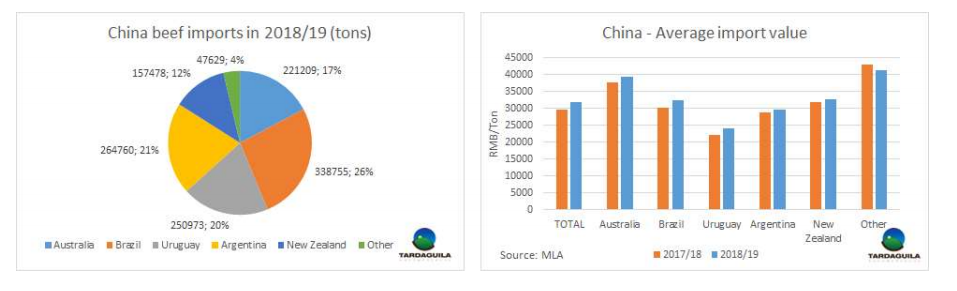 2018/19財年中國平均牛肉進口價格31684元/噸,比2017/18財年增長了7%,按美元計,約4600美元/噸。主要出口商均提高了出口中國的價格,巴西和烏拉圭提價最多,約8%,巴拉圭仍然保持較低的平均出口價格(23999元/噸,約3488元/噸),或許因為價值較低的帶骨牛肉占比較大。提價最少的是阿根廷,約提價2%。澳大利亞也出口帶骨牛肉,比烏拉圭出口量少,澳大利亞出口中國的冷凍牛肉中帶骨牛肉占比11%,烏拉圭帶骨牛肉占比25%。出口中國平均價格最高的是澳大利亞,新西蘭位居其次。2018/19財年,巴西雖然授權的工廠數(shù)量很少,卻是中國冷鮮牛肉的主要供應國,中國從巴西進口鮮牛肉33.9萬噸,占進口總量的26%,排在后面的是阿根廷(21%),烏拉圭(20%),澳大利亞(17%),新西蘭(12%)2018/19財年中國總進口量128萬噸,年增長55%。