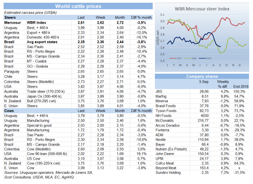 中美貿(mào)易戰(zhàn)的影響還在持續(xù),但本周初中國市場保持堅(jiān)挺。烏拉圭統(tǒng)牛無骨件套+帶骨肋排分開銷售可以保證整個牛的銷售,快速提升營業(yè)額,省下需求最大的牛骨和牛副。中國進(jìn)口增長受水漂市場影響,巴西出口香港前后腱3350美元/噸,牛副價格更好,價格與5月食品展時期相似。非洲豬瘟導(dǎo)致臺灣需求增長,巴拉圭也從中獲益,前后腱4900美元/噸,牛霖4600美元/噸。