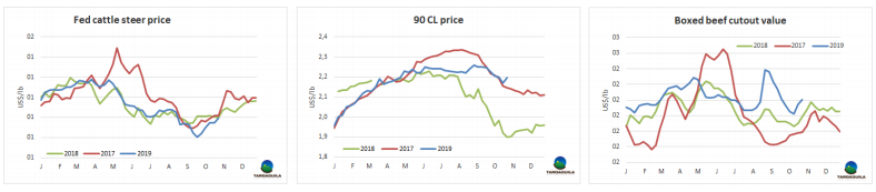 今年截至9月,按美元計(jì)閹牛價(jià)格的上漲以及貨幣價(jià)格的上漲超過(guò)了通貨膨脹率,使育肥閹牛的購(gòu)買(mǎi)力提高了22%。按照9月比索價(jià)格,工廠閹牛采購(gòu)價(jià)格39729比索/頭,比一年前的32696比索/頭,增長(zhǎng)22%。這是自2008年下半年雷曼兄弟經(jīng)濟(jì)危機(jī)11年來(lái)最高。