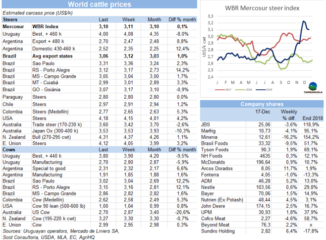 巴西和烏拉圭繼續(xù)壓低當地育成牛價格,而阿根廷稅率的變化抬高了閹牛出口價格。因此,南方共同市場閹牛價格指數下降1美分,胴體價格下降至3.1美元/公斤。巴西本周凈差額再次下降,盡管近幾天顯示出穩(wěn)定趨勢,本周雷亞爾升值2%不足以扭轉育成牛價格的下跌,價格按美元計下跌6美分,胴體價格下降至3.06美元/公斤。烏拉圭閹牛價格持續(xù)下跌,報價4美元/公斤,并將繼續(xù)下跌。阿根廷出口閹牛比索價格在穩(wěn)定了幾周之后本周開始上漲。我們必須考慮到稅率上漲使出口同等數量的肉變得更加昂貴。本周參考價格指數上漲23美分,胴體價格上漲至2.7美元/公斤。巴拉圭育成牛胴體價格連續(xù)第五周保持2.8美元/公斤。