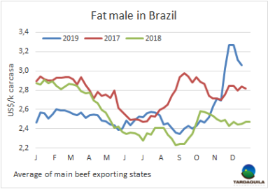 本周在巴西主要的活牛交易市場育成牛價格再次出現下行,近幾日有穩(wěn)定跡象,有些地區(qū)甚至出現上行修正。牛只供應有限,需求也是一樣,預計接下來幾天會繼續(xù)縮減,因為一些工廠在今年年末和2020年年初停止屠宰活動。圣保羅期貨市場第一批期貨(12月到2月)價格上漲,尤其是12月的合同價格上漲了6.6雷亞爾/15公斤,2020年年中以后仍然呈下行趨勢。批發(fā)市場牛肉價格繼續(xù)下跌。
