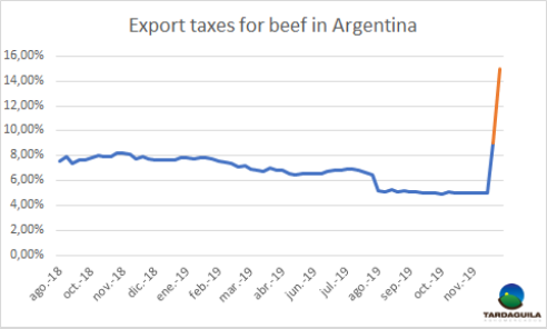 上任一周以來,宣布一系列聲明后,基什內爾政府阿爾貝托·費爾南德斯希望國會今天批準《經濟緊急狀態(tài)法》草案,該草案于昨日在議會上提交,將賦予他非凡的權力,在許多微妙的問題上避免立法的干預。此前,上周六發(fā)布了一項法令通過更改百分比,修改了前任政府2018年9月恢復出口加征關稅的規(guī)則,以前每出口1美元征收一定數量阿根廷比索的稅。(每出口1美元牛肉征收3阿根廷比索)。整體性的規(guī)則還未明確,大致分析的結果是牛肉的有效出口稅被定在9%,比15個月前打算加征的8%高1個百分點,考慮到比索貶值的影響,出口稅的數額比上周增長了4.2個百分點。該措施導致大豆出口稅率達30%,糧食和其他油籽稅率為12%。昨天,所有這些推理都變得抽象,因為在政府希望今天獲得批準的經濟緊急措施系列計劃中,對大豆的出口稅改為了33%,對2018年9月2日(馬克里重新征收出口稅之前)沒有涉及的產品,例如小麥,玉米和牛肉征收出口稅15%。根據當前的閹牛出口價格,按照稅率增長9%計算,每公斤胴體將被征收額外的17美分,如果稅率變?yōu)?span>15%,進口稅將增長約38美分。