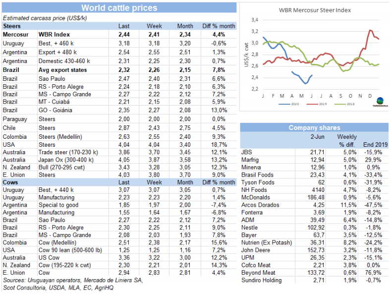 盡管美國(guó)疫情嚴(yán)重,美國(guó)市場(chǎng)仍有需求。據(jù)透露,阿根廷90CL牛前成交價(jià)5100美元/噸離岸價(jià)。烏拉圭方面主要的障礙是配額不足。事實(shí)上,上周烏拉圭向美國(guó)出口牛肉1023噸,這一速度是不可持續(xù)的,因?yàn)殛P(guān)稅優(yōu)惠的配額是2萬(wàn)噸。今年烏拉圭的總出口量已達(dá)7179噸,比去年同期增長(zhǎng)9.5%