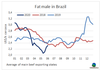 上周育成牛價(jià)格保持相對(duì)穩(wěn)定,保持五月價(jià)格走勢(shì)。巴西主要牛產(chǎn)區(qū),包括圣保羅、米納斯吉拉斯、馬托格羅索州期貨時(shí)限均保持在7-8天。在價(jià)格件套的基礎(chǔ)上,本周圣保羅育成牛價(jià)格上漲1雷亞爾/15公斤,上漲至193雷亞爾/15公斤,30天內(nèi)付款。隆多尼亞州活牛參考價(jià)也有上漲,上漲2雷亞爾至184雷亞爾/15公斤。其他地區(qū)價(jià)格保持不變。生產(chǎn)者仍然有大量的飼料,這使他們能夠保持放牧。隨著季節(jié)的變化,牧場(chǎng)在6月份狀況會(huì)惡化,這肯定會(huì)對(duì)育成牛價(jià)格造成負(fù)面影響。受新冠肺炎疫情影響,國(guó)內(nèi)市場(chǎng)需求依然偏謹(jǐn)慎。市場(chǎng)報(bào)告顯示,上周末的需求表現(xiàn)良好,批發(fā)市場(chǎng)價(jià)格保持穩(wěn)定。