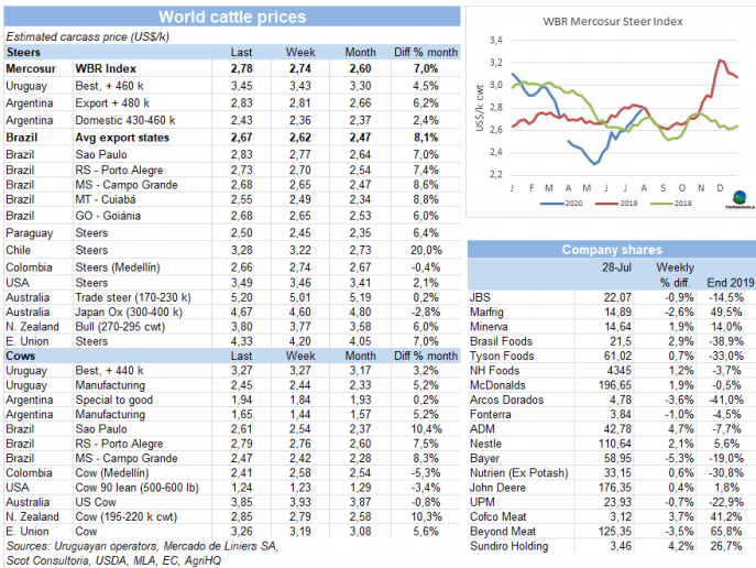 本周南美國家待宰牛價格上漲,上漲趨勢受到密切關(guān)注。南方共同市場閹牛價格指數(shù)上漲4美分,至2.78美元/公斤,達(dá)三月上半月新冠疫情在南美地區(qū)爆發(fā)以來新高。較五月中旬牛價低點(diǎn)時上漲了48美分,上漲了21%。巴西,按本地雷亞爾計(jì)的成交價再次上漲。本周美元在全國范圍內(nèi)下跌,而巴西雷亞爾升值1.2%。巴西主要出口周育成牛價格上漲5美分,上漲至2.67美元/公斤。巴拉圭由于在口蹄疫接種階段活牛供應(yīng)量少,價格保持上漲趨勢。阿根廷和烏拉圭活牛參考價本周上漲2美分,分別上漲至2.83美元/公斤和3.45美元/公斤。烏拉圭目前已經(jīng)看到價格上漲趨勢將在本季度后停止。