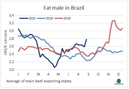 8月巴西牛犢的平均價格同比上漲了約56%,漲幅高于育成牛的價格漲幅。全年補欄率大幅上升。犢平均體重180公斤的8個月斷奶的牛,報價每公斤11.1雷亞爾,比2019年8月的平均價格7.11雷亞爾/公斤高出56%。”同一時期,主要出口州,育成牛價格增長了47%,從146.2雷亞爾/15公斤增長到214.7雷亞爾/15公斤。補欄率增加到1.49,鼓勵育種者在繁殖群中保留母牛,母牛的屠宰供應減少。