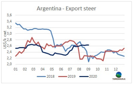 出口牛價再次保持堅挺,某些成交價上漲了1比索。最好的英國純種閹牛成交價191-196比索/公斤,印度串種閹牛186-190比索/公斤,特優(yōu)種母牛158-163比索,工業(yè)母牛價格在136-143比索/公斤。