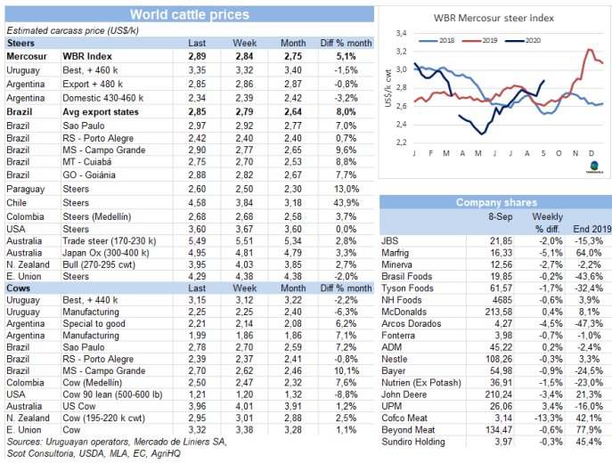 本周南方共同市場(chǎng)閹牛價(jià)格指數(shù)再次上漲了5美分,上漲至2.89美元/公斤,達(dá)三月初至今六個(gè)月來(lái)最高。巴西再次成為上漲的主要影響因素,補(bǔ)欄進(jìn)程推高了育成牛雷亞爾價(jià)格,較四月下半月上漲了30%,上周一周內(nèi)上漲了6美分,上漲至2.86美元/公斤,達(dá)二月最后一周以來(lái)最高。巴拉圭活牛市場(chǎng)價(jià)格也有上漲,出口閹牛參考價(jià)達(dá)2.6美元/公斤,也會(huì)到了三月初的水平。烏拉圭和阿根廷出口閹牛價(jià)格保持穩(wěn)定,烏拉圭參考價(jià)3.35美元/公斤,阿根廷參考價(jià)2.61美元/公斤。