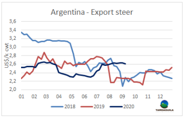 用于出口的牛價(jià)格已經(jīng)恢復(fù)了元?dú)?,不過(guò)由于以色列假期和歐洲需求的下降,預(yù)計(jì)牛價(jià)將會(huì)下降。最好的英國(guó)純種閹牛成交價(jià)191-196比索/公斤,印度串種閹牛186-190比索/公斤,特優(yōu)種母牛158-163比索,工業(yè)母牛價(jià)格在136-143比索/公斤。