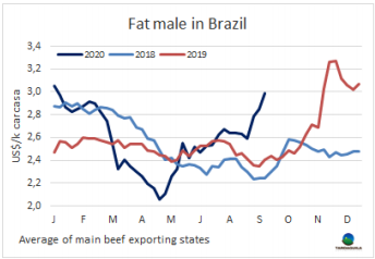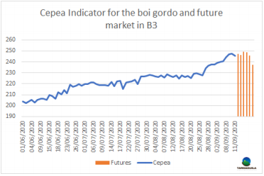 巴西主要出口州育成牛平均價格自六月初價格開始上漲以來上漲了30%。受供應(yīng)短缺和出口需求尤其是中國市場需求強勁的影響,與去年九月中相比,上漲接近60%。本周巴西主要出口州育成牛價格上漲至237雷亞爾/15公斤,30天付款,免運費。期貨市場參考價Cepea育成牛價格指數(shù)為245.65雷亞爾/15公斤。較本周中間幾天247雷亞爾/15公斤的最高價有輕微下降。略低的價格影響育成牛期貨價格輕微下行。預(yù)計當(dāng)前的價格將保持堅挺,因為市場仍是然以供應(yīng)端為主導(dǎo)。但價格的上行趨勢將結(jié)束。11月和12月價格預(yù)計將達250雷亞爾/15公斤,到2021年五月價格將達237雷亞爾/15公斤。