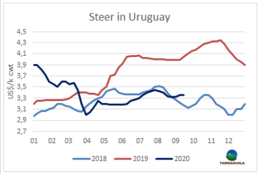 中國市場有需求,盡管一些進口商的采購仍然很謹(jǐn)慎,聲稱市場上現(xiàn)貨庫存仍然很大。然而接受采訪的市場參與者均表示整體趨勢更加樂觀了。一些中國進口商已經(jīng)開始為下一個春節(jié)做準(zhǔn)備,船期必須要保證在10月至12月之間。巴西出口商稱中國主港和香港的需求都更加強勁了,香港前后腱成交價4600美元/噸,價格還有可能成交到更高的水平。水漂市場牛副價格和需求都有所上漲。一位業(yè)內(nèi)人士稱收到中國方面對牛前的還價4800美元/噸,但活牛價格非常高,即使價格在這一水平,也很難成交。另一方面烏拉圭羊肉的需求旺盛,但成交仍需謹(jǐn)慎,因為活羊數(shù)量不足,很可能讓價格停止上漲。同時巴拉圭出口商強調(diào)近幾個月臺灣方面的進口價格和需求水平都更穩(wěn)定了,前后腱成交價范圍在3500-3800美元/噸,肩胛背肩成交價3500-3600美元/噸,也有一些后部位肉和牛柳賣到臺灣市場。