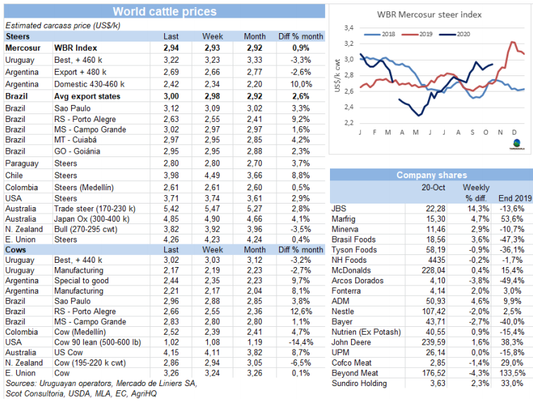 本周南方共同市場閹牛價格指數(shù)再次回漲1美分至2.94美元/公斤。上漲主要以由于巴西和阿根廷活牛價格堅挺抵消了烏拉圭的牛價疲軟。巴拉圭活牛價格保持堅挺,2.8美元/公斤。巴西主要出口州育成牛平均價格上漲2雷亞爾/15公斤,上漲至250.9雷亞爾/15公斤。匯率基本保持不變,美元價格上漲了2美分至3美元/公斤。阿根廷活牛價格上漲了3比索/公斤,回到了幾周前的參考價水平。盡管國內(nèi)市場和歐洲市場需求疲軟,美元價格上漲了3美分至2.69美元/公斤。烏拉圭活牛參考價3.22美元/公斤,大部分成交在3.2美元/公斤。