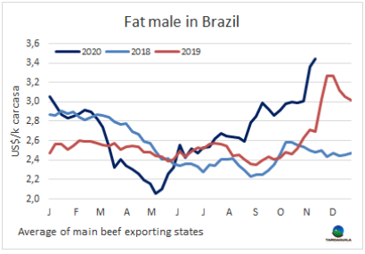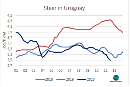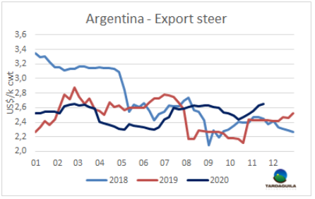 南方共同市場閹牛價格指數(shù)本周再次上漲4美分,上漲至3.22美元/公斤,達(dá)2019年11月至今一年以來最高。影響閹牛價格指數(shù)上漲的主要因素還是巴西牛價,盡管近幾周來上漲趨勢有可能停止的跡象。股市指標(biāo)大幅上升,包括雷亞爾在內(nèi)的新興國家貨幣也大幅上升。巴西主要出口州育成牛價格本周上漲8美分,上漲至3.44美元/公斤,拉大了與其他地區(qū)的差距。巴西牛價上漲是由于本地牛價上漲和匯率上漲導(dǎo)致的。阿根廷和巴拉圭牛價保持堅挺,本周上漲2美分,阿根廷出口閹牛價格上漲至2.98美元/公斤,包含9%的出口稅。巴拉圭牛價保持2.95美元/公斤。烏拉圭牛價下行趨勢仍然持續(xù),草飼閹牛2.9美元/公斤,較阿根廷僅高1美分,阿根廷牛價仍為南美地區(qū)最低。