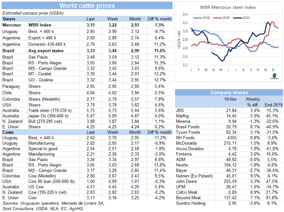 本周烏拉圭育成閹牛價(jià)格達(dá)南美地區(qū)最低,這是近十年來鮮有發(fā)生的,也是2017年四月以來第一次達(dá)本地區(qū)最低。本周烏拉圭特種出口閹牛成交價(jià)2.85美元/公斤,低于阿根廷的出口閹牛成交價(jià)2.92美元/公斤和巴拉圭的胴體成交價(jià)2.95美元/公斤。巴西牛價(jià)仍明顯高于其他地區(qū),盡管上漲的趨勢(shì)有所停頓,上周開始牛價(jià)走勢(shì)下行調(diào)整,巴西主要出口州育肥牛平均價(jià)格下降了11美分,下降至3.33美元/公斤。南方共同市場(chǎng)閹牛價(jià)格指數(shù)本周下降了7美分,下降至3.15美元/公斤。