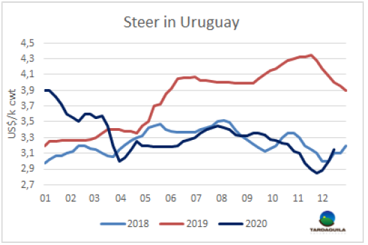 阿根廷牛價飆升,成為南美地區(qū)牛價最高的國家,這是自2017年至今三年來從未發(fā)生過的事情。本周育肥閹牛供應(yīng)短缺再次推高價格。包含出口稅的美元價格3.39美元/公斤,較上周上漲了8美分。烏拉圭閹牛價格也由于供應(yīng)短缺大幅上漲,本周成交價3.15美元/噸。恰恰相反,巴拉圭和巴西的牛價下行,本周巴西牛價按雷亞爾計下跌了5%,雷亞爾0.7%的升值部分抵消了雷亞爾價格的下行。巴西中央銀行表示,即將放棄將參考利率保持在最低水平的承諾,目前美元雷亞爾匯率為5.育成牛平均價格本周下跌了14美分至3.22美元/公斤。巴拉圭方面育成牛價格下跌至2.7美元/公斤。因此,南方共同市場閹牛價格指數(shù)下跌了5美分,下跌至3.2美元/公斤。