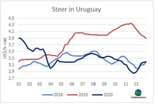 本周南方共同市場閹牛價格以上漲結束了2020年的走勢。本周價格上漲了2美分,上漲至3.28美元/公斤,較本年度價格最高點僅相差5美分(12月初時),較5月南美地區(qū)疫情最嚴重時牛價最低點高90美分(39%)。本周南美牛價指數(shù)上漲主要由于巴西和烏拉圭牛價上漲,本周巴西育成牛價格上漲了4雷亞爾,上漲至248雷亞爾/15公斤,結束了前幾周的下行趨勢,由于雷亞爾貶值,美元價格漲幅較小,美元牛價上漲了3美分至3.18美元/公斤。烏拉圭由于供應減少,特種閹牛價格上漲了2 美分,上漲至3.2美元/公斤。阿根廷方面前幾周市場堅挺,本周趨于平穩(wěn),由于阿根廷比索貶值蓋過了本地牛價的上漲,出口閹牛價格下跌了1美分至3.49美元/公斤。巴拉圭市場活牛價格連續(xù)第三周保持平穩(wěn),保持2.7美元/公斤。