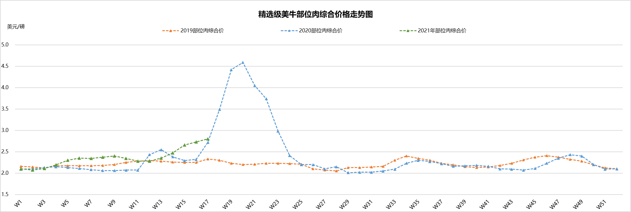 最近兩周美國(guó)活牛價(jià)格穩(wěn)中微跌,本周活牛價(jià)格1.21美元/磅。盡管批發(fā)市場(chǎng)牛肉價(jià)格不斷上漲,但育肥場(chǎng)充足的供應(yīng)和工廠的產(chǎn)能限制仍然是制約活牛價(jià)格上漲的兩個(gè)主要原因。