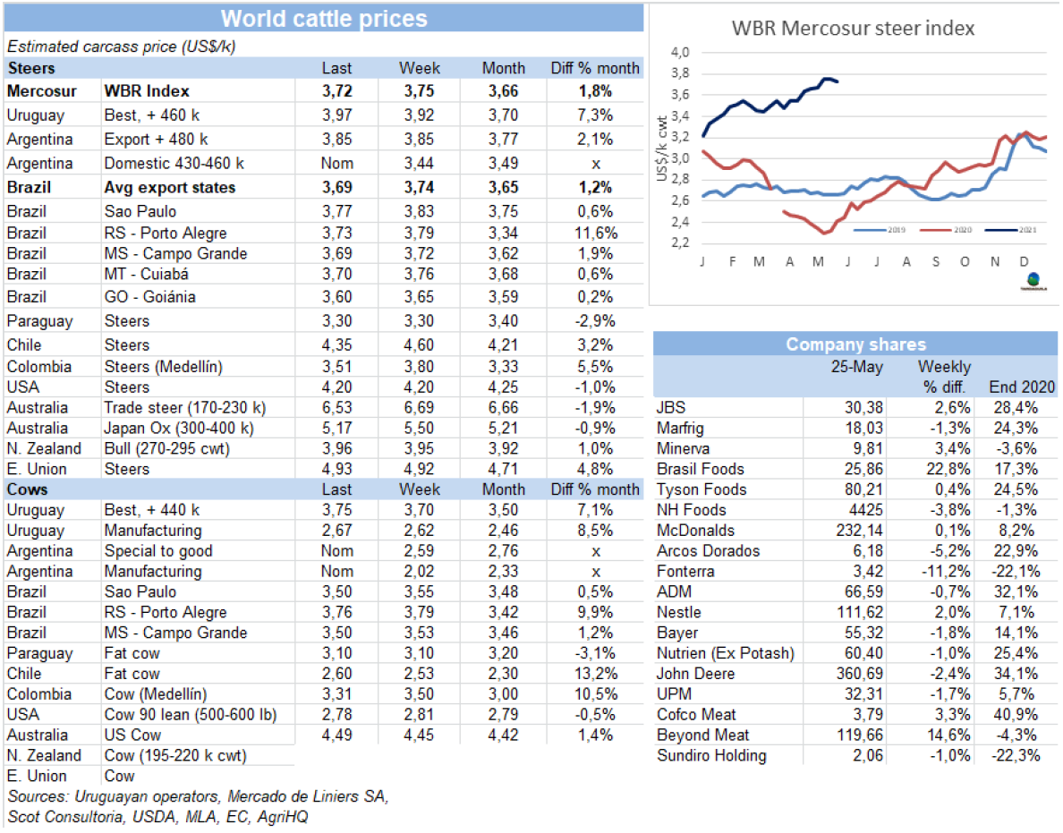 中國市場的牛肉需求仍然堅(jiān)挺,一些進(jìn)口商猜測阿根廷將回歸進(jìn)口市場,集裝箱短缺的問題令人困擾,也增加了進(jìn)口成本。一位烏拉圭肉類工廠相關(guān)人士反映,他們很擔(dān)心目前的價格上漲,他們擔(dān)心一些進(jìn)口商現(xiàn)在愿意花這么貴的價格但后面如果阿根廷回歸市場,向市場大量報貨,這些合同將面臨重新議價和取消,目前我們唯一可以確定的因素就是活牛價格,而我們現(xiàn)在看到的是通貨膨脹升級,牛肉貿(mào)易風(fēng)險很大,目前大多數(shù)工廠買6月到7月上旬交貨的閹牛的價格是4美元/公斤。目前的牛肉市場很不明朗,許多進(jìn)口商在觀望阿根廷方面的消息,中國市場非常大,總有買家可以出的上瘋狂的價格,但近幾周我的客戶沒有買貨。除了中國市場采購持續(xù)性帶來的不確定性,集裝箱短缺是另一個令人頭疼的問題,一位業(yè)內(nèi)人士反映,去年租一個集裝箱運(yùn)往中國的費(fèi)用是2700-2900美元,4月價格漲到了3500-3900美元,現(xiàn)在聽說快漲到了4600美元,相當(dāng)于每噸出口牛肉的訂艙費(fèi)用增加了180美金。貿(mào)易商稱由于訂艙費(fèi)用的差別,他與進(jìn)口商設(shè)法就貨運(yùn)合同進(jìn)行談判,“我有新的合同成交,但是由于缺少集裝箱不能發(fā)船。另一方面,人民幣匯率上漲到了3年來最高水平,對美元匯率6.405。一年內(nèi)人民幣的價格增值了10%。去年5月,由于全球新冠肺炎疫情帶來的不確定性,人民幣兌美元匯率為7.14。巴西方面,市場仍充滿挑戰(zhàn),屠宰量水平低,肉類加工廠面臨虧損。一位貿(mào)易商稱,過去兩周內(nèi)我們幾乎沒有新的成交。另一方面,有貿(mào)易商反映烏拉圭羊肉銷量保持堅(jiān)挺,羔羊胴體價格6600-6700美元/噸,羊肉價格5600美元/噸,羊六分體6000美元/噸。