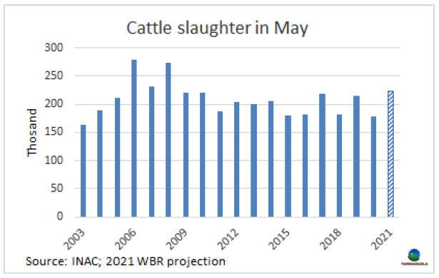 上周牛屠宰量再次增長,烏拉圭肉協(xié)報告統(tǒng)計(jì),上周屠宰量55712頭,較前一周增長了2000多頭,達(dá)今年周屠宰量的第二高。較去年同期增長了超過10000頭。隨著歐洲481配額的生產(chǎn)全面打開,閹牛屠宰量達(dá)29938頭,達(dá)2018年3月第三周至今三年多以來最大,同樣,小母牛屠宰量達(dá)6263頭,達(dá)3月第一周以來最大。相反,母牛屠宰量下降至18598頭,較上周下降了2432頭。屠宰量最大的工廠是Athena-Pulsa(4956頭),Las piedras(4532頭),Athena-Canelones(4476頭)。本周Athena三家工廠屠宰總量13639頭,Marfrig四家工廠屠宰總量13772頭,日資企業(yè)BPU上周五進(jìn)行了最后一次屠宰活動,本周暫未開始屠宰,還在等待中國市場的重新準(zhǔn)入。截止5月22日,牛屠宰量達(dá)160548頭,較2020年同期增加了15575頭,約增長了20%。如果不出現(xiàn)疫情相關(guān)的重大問題,五月屠宰量將超過22萬頭,達(dá)10年以來最高。 5月也將成為連續(xù)第八個屠宰量高于去年同期的月份。