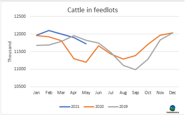 自2018年七月起,巴西牛肉月出口量連續(xù)34個月超過10萬噸。在此之前,月出口量超過10萬噸連續(xù)最長的階段是自2006年5月至2007年6月的連續(xù)14個月。據(jù)分析,這是強(qiáng)勁的國際市場需求所導(dǎo)致的,尤其是來自中國的需求。巴西的產(chǎn)能無法跟上日益增長的需求,帶來的結(jié)果則是待宰牛、架子牛和國內(nèi)市場牛肉價格的持續(xù)上漲。2018年7月育肥牛平均價格209雷亞爾/15公斤,2018年年末育肥牛價格上漲至219雷亞爾/15公斤。2019年年初育肥牛參考價220雷亞爾/15公斤,2020年育肥牛價格達(dá)300雷亞爾/15公斤。2021年前5個月育肥牛價格達(dá)310雷亞爾/15公斤,今年年底到期的期貨合約價格將達(dá)約330雷亞爾/15公斤。