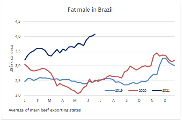 六月前13個交易日巴西牛肉出口量97584噸,平均出口離岸價5160美元/噸。較2020年六月出口額下增長了3.8%,平均價格上漲了20%,并在六月第三周保持了這一趨勢。雞肉和豬肉的出口量也有增長,相比2020年,雞肉出口量增長了15%,平均價格增長了27%,豬肉出口量增長了3%,平均出口價格增長了21%。