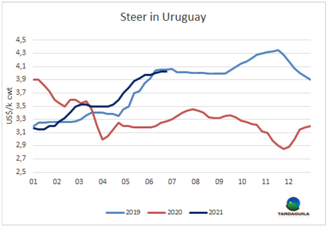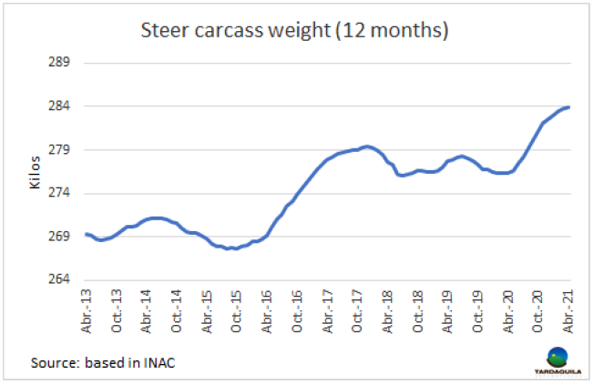 由于出口市場為體重較大的閹牛售價可觀,閹牛平均胴體重量持續(xù)增長。截止4月烏拉圭肉協(xié)最近一次發(fā)布的數(shù)據(jù)前的12個月內(nèi)閹牛平均體重283.9公斤,創(chuàng)新紀錄。截止2020年4月的12個月內(nèi)閹牛平均體重276.3公斤,今年4月的平均體重增長了7.6公斤。牛肉行業(yè)中體重較大的閹??梢再I上更好的價錢,因此生產(chǎn)者對此做出反應。在胴體重量上上烏拉圭仍需繼續(xù)努力,在美國等發(fā)達國家的牛只平均體重更重一些。澳大利亞的公牛和母牛體重繼續(xù)創(chuàng)新紀錄,第一季度的體重紀錄分別為341公斤和281公斤。烏拉圭的閹牛體重比澳大利亞輕57公斤,母牛均重較澳大利亞輕45公斤。