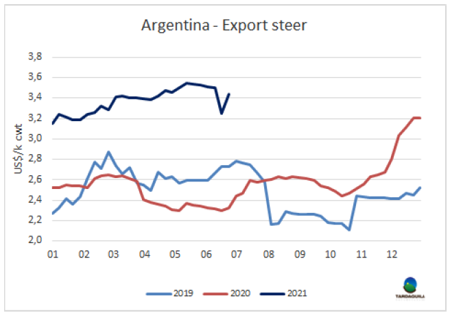 由于中國已經(jīng)成為主要牛肉出口市場,而下半年的需求是最大的一段時間,為春節(jié)假期備貨的采購也發(fā)生在下半年??紤]到今年前幾個月中國市場之堅挺,下半年的價格將更上一層樓。但中國市場近幾周的發(fā)展趨勢并沒有證實這一預測,需求堅挺,采購意向也很多,但價格看起來并不會持續(xù)上漲。阻礙價格上漲的主要原因是中國市場豬肉價格的下跌,并且沒有反彈趨勢。盡管政府稱豬肉產(chǎn)能已經(jīng)恢復到了非洲豬瘟之前的水平,仍有人認為此次價格下跌是由于農(nóng)戶擔心更具傳染性的新型豬瘟病毒導致疫情復發(fā),從而造成更嚴重的損失而提前出欄。支撐牛肉價格堅挺的原因是主要牛肉供應國產(chǎn)量處于低水平,加之阿根廷降低牛肉出口量,尤其是對中國的出口。因此中國市場牛肉與豬肉價格差將擴大,而豬肉價格難有大幅回彈。據(jù)預測,下半年牛肉價格將保持堅挺,而就目前來看價格沒有大幅增長。