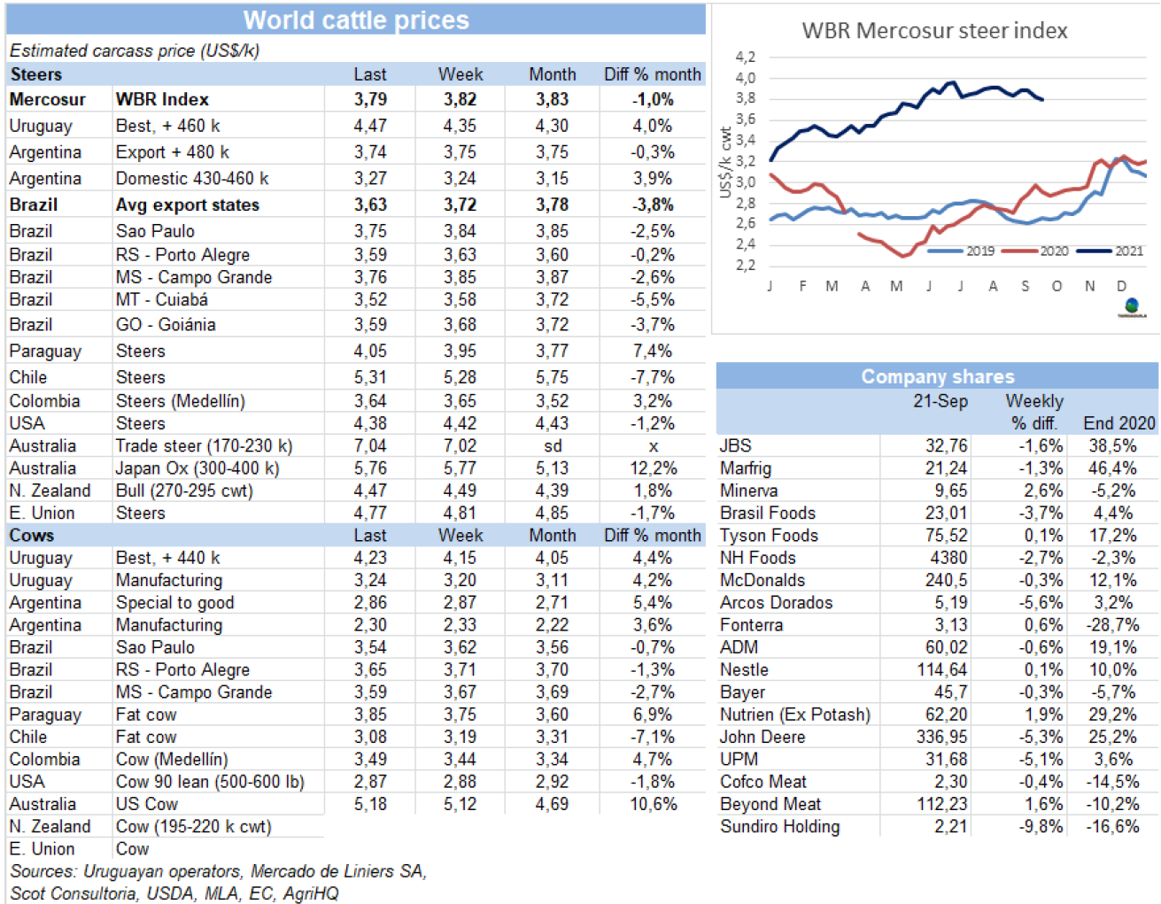 上周三的停工對(duì)肉類加工業(yè)的活動(dòng)產(chǎn)生了影響。INAC報(bào)告稱,在截至9月18日的一周內(nèi),牛屠宰量47168頭,比前一周少7409頭,是自8月1日以來的最小數(shù)量。不過仍然遠(yuǎn)遠(yuǎn)高于去年這個(gè)時(shí)候的35000頭。大多數(shù)屠宰場周三沒有屠宰,在目前的情況下,盡管一周其余幾天的屠宰增加,無法抵消周三屠宰量的缺口。本周閹牛屠宰量23,662頭(較上周-15%),母牛16,674頭(較上周-15%),小母牛6,134頭(較上周-4%)。屠宰量領(lǐng)先的工廠是Las Piedras(4508頭),美麗華的Pulsa(4475頭)和Canelones(3834頭)。美麗華三個(gè)工廠屠宰量12025頭,較上周減少了1195頭,而Marfrig三個(gè)工廠屠宰了8806頭牛,較上周減少了1928頭。9月前18天,牛屠宰量137683頭,比2020年同期增加了49%。