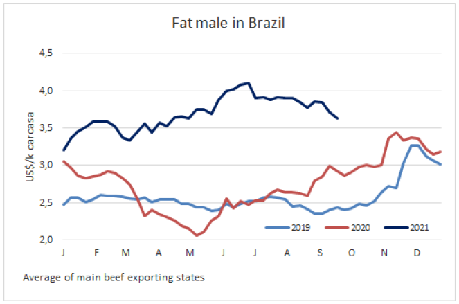 巴西育肥牛價(jià)格下跌繼續(xù)拉低南美市場閹牛價(jià)格指數(shù)。本周南方共同市場閹牛價(jià)格指數(shù)下跌3美分至3.79美元/公斤,達(dá)五月末以來最低。中國暫停進(jìn)口巴西牛肉這一決策繼續(xù)延長的事實(shí)給本周育肥牛價(jià)格價(jià)格帶來了5雷亞爾/15公斤的下行壓力。由于中國房地產(chǎn)市場危機(jī)對(duì)新興國家貨幣的影響,美元價(jià)格的跌幅更大。育肥牛美元價(jià)格下跌了9美分至3.63美元/公斤。阿根廷出口閹牛的價(jià)格穩(wěn)定在3.75美元/公斤。巴拉圭和烏拉圭的價(jià)格在一周內(nèi)上漲了約10美分。巴拉圭育肥公牛價(jià)格4.05美元/公斤,烏拉圭育肥公牛價(jià)格達(dá)4.45-4.50美元/公斤,創(chuàng)最高紀(jì)錄。