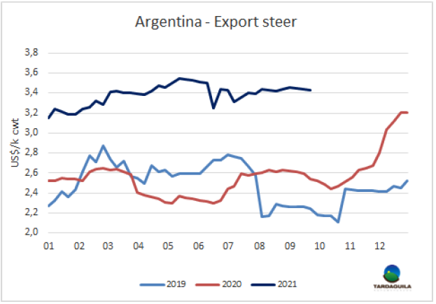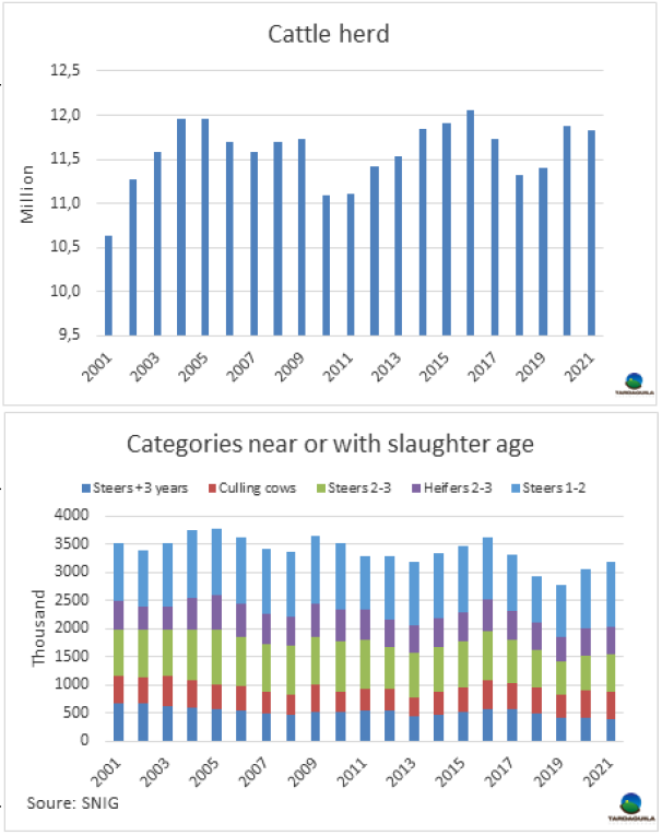 考慮到牛存欄量和畜產(chǎn)面積,每公頃牛存欄量從去年的0.73個(gè)減少到今年的0.72個(gè)。低于過去10年的平均水平(0.735)。因此,如果從氣候的角度來看,這一年沒有重大的氣象災(zāi)害,那么在牧草供應(yīng)方面就應(yīng)該沒有重大的損失。然而有警告稱,今年是拉尼娜年份,這意味著降雨低于正常水平的可能性更大,主要是在11月至1月期間。