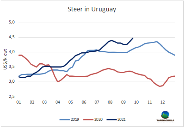 育肥閹牛的價(jià)格持續(xù)飆升,創(chuàng)新紀(jì)錄。特種閹牛價(jià)格4.45美元-4.50美元/公斤不含運(yùn)費(fèi),45天付款。這一價(jià)格超過了此前在今年8月初達(dá)到的最高水平,超過2019年11月初的水平。較年初的價(jià)格增長了1.30美元/公斤,增長了41%。供應(yīng)仍然是稀缺的。預(yù)訂時(shí)間縮短至7-10天,一些中型工廠仍在預(yù)訂本周的牛。重型母牛參考價(jià)4.25-4.2美元/公斤,國內(nèi)市場補(bǔ)欄用的輕型母牛仍然很少,小母牛4.2-4.3美元/公斤。烏拉圭美麗華3廠將在今天完成最后的屠宰,然后開始給員工放假。原定于本月初暫停屠宰,后來推遲到中國暫停進(jìn)口巴西牛肉后。Marfrig的12廠將從下周二開始恢復(fù)屠宰,該公司在該國的四個(gè)工廠將繼續(xù)進(jìn)行屠宰。烏拉圭的春季氣候不錯(cuò),陽光明媚,土壤水分充足。農(nóng)民要做出選擇是繼續(xù)在他們的土地上增加廉價(jià)的瘦牛,還是隨著牧草供應(yīng)的改善而上升之前賣掉他們以購買架子牛。預(yù)計(jì)市場將保持堅(jiān)挺。