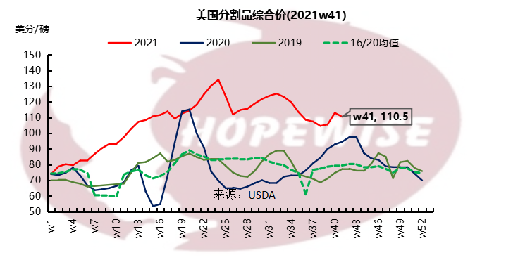美國9月生豬均價(jià)0.83美金/磅,環(huán)比下滑15.45%,同比上漲47%。豬胴體價(jià)格1.07美金/磅,環(huán)比下滑10.47%,同比增長26.97%。生豬價(jià)格處于季節(jié)性下滑階段。9月最后一周,豬各部位肉的平均批發(fā)價(jià)格與6月中旬達(dá)到的年度峰值相比下降約20%。雖然生豬產(chǎn)量有增加,仍低于去年同期水平。9月周度生豬屠宰量246.08萬頭,環(huán)比增加2.13%,同比減少3.04%。生豬周度產(chǎn)量23.32萬噸,環(huán)比增加1.96%,同比減少3.36%。