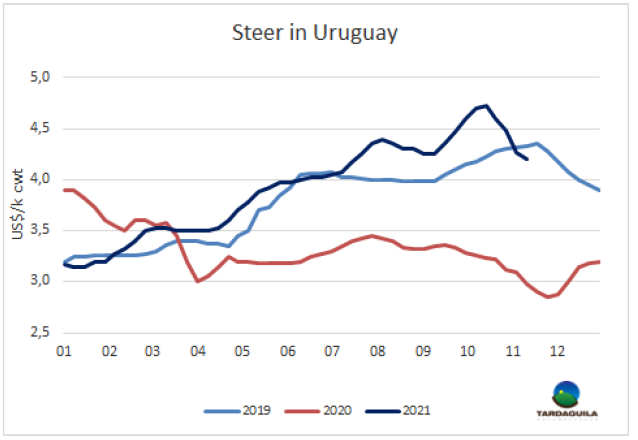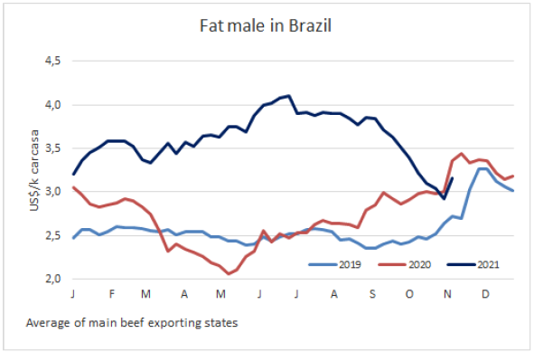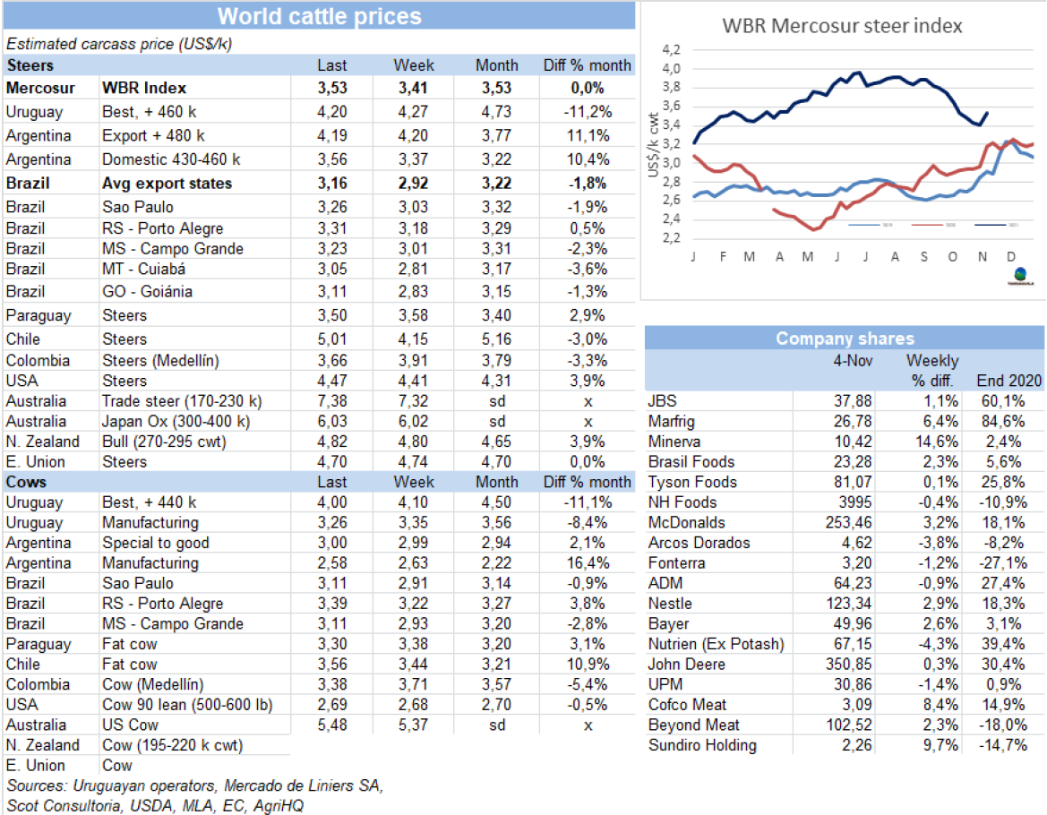 南方共同市場(chǎng)閹牛價(jià)格指數(shù)較上周上漲12美分至3.53美元/公斤。此次上漲最主要受巴西市場(chǎng)育肥牛平均價(jià)格急劇上漲的影響,而本周雷亞爾增值了3.6%,因此巴西主要出口州育肥牛平均價(jià)格上漲了24美分至3.16美元/公斤。阿根廷市場(chǎng)含9%出口稅的出口閹牛的價(jià)格穩(wěn)定在4.2美元/公斤;烏拉圭牛價(jià)水平與阿根廷相當(dāng)。巴拉圭方面牛價(jià)漲勢(shì)短暫,本周有10美分的下行調(diào)整,達(dá)3.5美元/公斤。