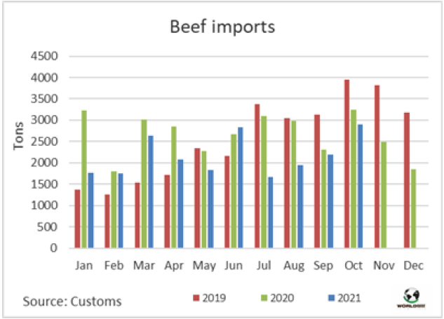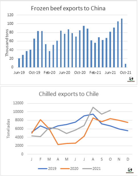 烏拉圭和該地區(qū)其他國(guó)家10月份的牛價(jià)差異很大,導(dǎo)致牛肉進(jìn)口量每月增加700多噸,主要是后部位肉。根據(jù)海關(guān)數(shù)據(jù),2909噸新鮮牛肉進(jìn)入該國(guó),其中2765噸是冰鮮牛肉。十月冰鮮牛肉的平均價(jià)格為4974美元/噸,略高于九月1.5%。這是因?yàn)楹蟛课蝗膺M(jìn)口量在總進(jìn)口量中占比大大增加,從9月的1303噸增至10月的2088噸,而前部位肉的采購(gòu)量仍維持在670噸左右。巴西是冰鮮牛肉的主要進(jìn)口來(lái)源國(guó),其中91%的進(jìn)口冰鮮牛肉來(lái)自巴西,其余的來(lái)自巴拉圭。10月進(jìn)口量最大的公司是Abasto de Carnes Saturno(511噸),其次是Santa Clara(475噸)和Maufe(381噸)。截至今年10月,烏拉圭累計(jì)牛肉進(jìn)口量21647噸,比2020年同期減少了21%。