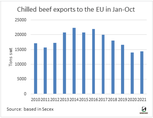巴西對(duì)歐盟冰鮮牛肉出口量與2020年相當(dāng),處于較低水平