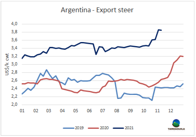 自6月份以來(lái),牛屠宰量一直在下降。分析師認(rèn)為,這種下降很大程度上與育肥場(chǎng)正在經(jīng)歷的困難有關(guān),育肥場(chǎng)面臨高昂的投入成本,而這些成本無(wú)法向牛價(jià)轉(zhuǎn)化?!跋鄬?duì)而言,11月和12月的屠宰量將會(huì)下降更多,這兩個(gè)月通常是屠宰活動(dòng)活躍的月份。目前育肥的最后一個(gè)階段還沒(méi)有完成,但我們看到盈利能力下降,我們意識(shí)到,牛被宰殺用來(lái)消費(fèi)銷售價(jià)值幾乎損失了15%,大約每頭1萬(wàn)比索。我們11月的待宰牛供應(yīng)會(huì)比較少,12月的供應(yīng)更緊缺,更不用說(shuō)1月、2月和3月了,”AgroVa電臺(tái)節(jié)目的專家表示。