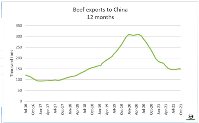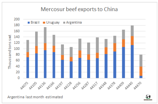 10月南美市場(chǎng)對(duì)中國(guó)牛肉出口量下降了約10萬(wàn)噸