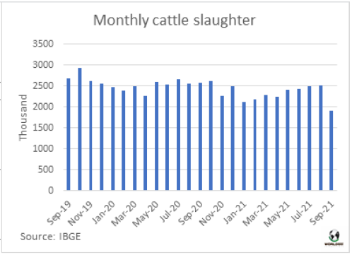 巴西地理統(tǒng)計研究所(IBGE)的調(diào)查顯示,2021年第三季度,巴西衛(wèi)生檢疫機構(gòu)注冊的屠宰場牛屠宰量達691萬頭。與2020年第三季度相比下降了11.1%,與2021年第二季度相比下降了2.4%。屠宰量的下降主要發(fā)生在9月份,當時對中國的出口暫停,導致出口工廠的需求急劇下降。當月牛屠宰量191萬頭,是自2004年3月(17年前)以來的最低月屠宰量。2021年第三季度牛肉產(chǎn)量(胴體重量)188萬噸,較2020年同季度下降了9.4%,較今年第二季度下降了0.4%,平均胴體重量的增長部分抵消了屠宰量的下降。今年第三季度待宰牛均重272公斤,較去年同期增長了5.2公斤。