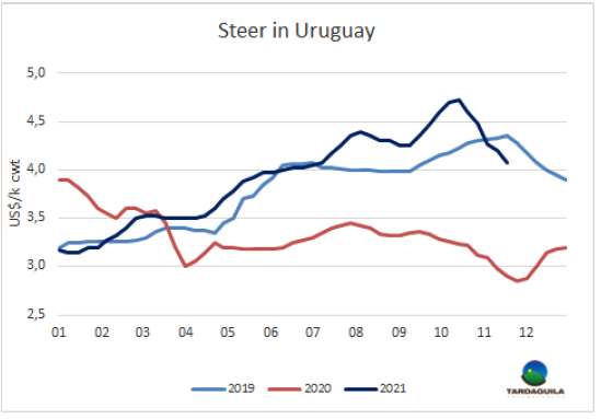 閹牛類型價值,是對牛肉工廠出售牛分割出的所有產(chǎn)品價格的加權(quán)估算,10月閹牛類型價值達歷史新高。據(jù)INAC的報告,閹牛類型價值平均1389美元,比9月增加了22美元,比去年同期增加了261美元(23%)。INAC稱這是因為“出口部位肉和國內(nèi)市場胴體價格的上漲”。相反,鮮皮、內(nèi)臟和副產(chǎn)品價值下降。相反,10月活牛采購價上漲了53美元/頭至1233美元/頭?;钆2少弮r與閹牛類型價值之間的差額(INAC稱之為工業(yè)增加值)本月減少了31美元至156美元,僅為閹牛類型價值的11.2%。
