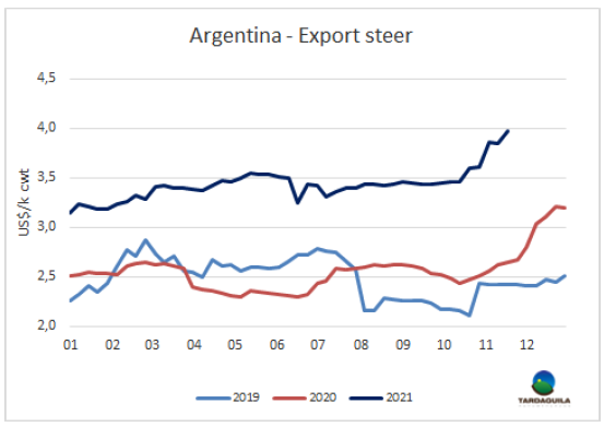 上周希爾頓臀肉出口價格急劇下跌,一系列因素給市場帶來不確定性。首先是歐洲市場對第四波疫情采取了新的管控,德國和荷蘭宣布了新的防疫限制措施,奧地利則選擇控制未接種疫苗的人口(超過30%),以遏制疫情的傳播。上周歐元走軟,人們猜測明年1月1日開放的下一個季度配額窗口會有大量481配額的牛肉進入。盡管阿根廷方面的報盤有限,成交價達13300-13800美元/噸離岸價。最近幾天由于工會罷工屠宰活動減少了很多。