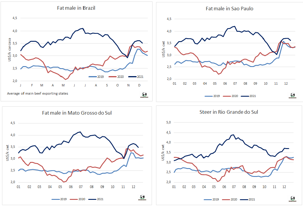育肥牛價格本周全面下跌。主要原因是12月上半月國內(nèi)市場表現(xiàn)不佳,和無法出口中國。唯一牛價沒有下行的地區(qū)是南里奧格蘭德州,南馬托格羅索州和馬托格羅索州牛價有持續(xù)下跌,育肥牛價格較上周下跌了7-8雷亞爾/15公斤分別下跌至297.5雷亞爾/15公斤和291.5雷亞爾/15公斤。圣保羅州牛價下跌了4.5雷亞爾/15公斤,至308.5雷亞爾/15公斤。圣保羅州預定時間在8天左右,工廠的采購價格仍保持下行壓力。包裝工廠和分銷商的牛肉庫存都很大。