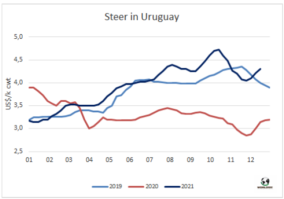 本周南方共同市場閹牛價格指數(shù)在連續(xù)五周的上漲之后下跌,本周下跌了4美分至3.86美元/公斤。該指數(shù)下跌的主要原因是巴西育肥牛雷亞爾價格下滑。此外,巴西雷亞爾兌美元匯率下跌了0.9%,巴西主要出口州育肥牛價格本周下降了10美分至3.51美元/公斤,與其他地區(qū)相比,巴西的價格拉開了與其他地區(qū)牛價的差距。相反烏拉圭市場堅挺,特種重型閹牛貿(mào)易參考價4.3美元/公斤。阿根廷和巴拉圭市場保持穩(wěn)定,阿根廷出口閹牛參考價在4.58美元/公斤,巴拉圭參考價3.8美元/公斤。